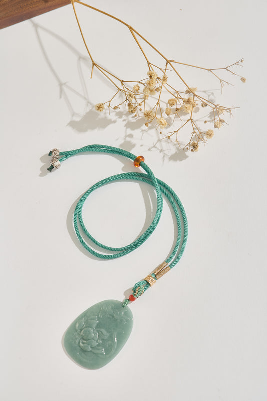 Lotus Serenity – Hand-Carved Jade Pendant Necklace with Silk Cord & Gold Details