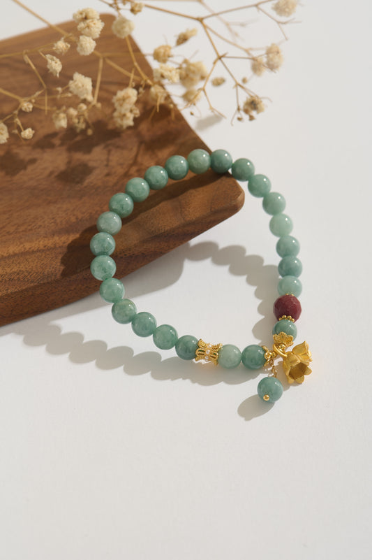 Natural Jadeite Jade Bracelet with Red Agate & Gold Lily Charms – High-Grade Burmese Type A Jade Beaded Bracelet for Women