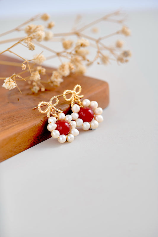 Handmade Red Agate & Freshwater Pearl Stud Earrings with Gold Bow – 14k Gold Filled Wire Wrapped Jewelry