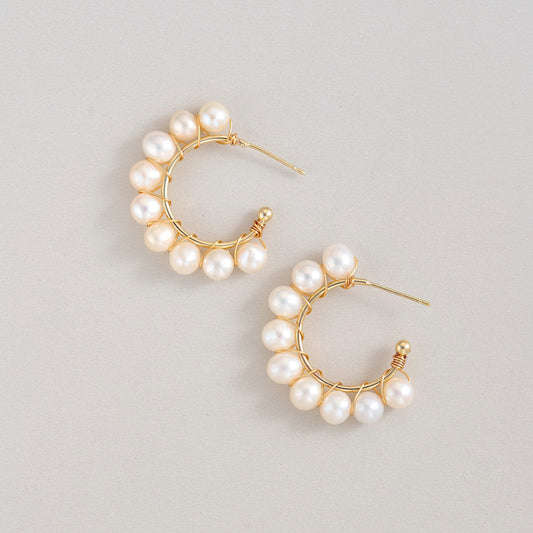 Handmade 14K Gold Filled Wire Wrapped White Freshwater Pearl Hoop Earrings | Classic Pearl Statement Earrings | Non-Tarnish & Hypoallergenic