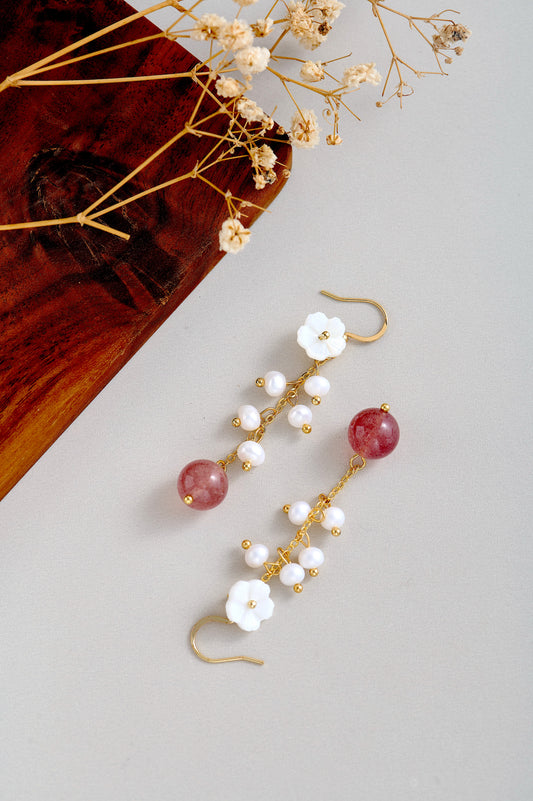 Handmade 14k Gold-Filled Earrings with Strawberry Quartz, Freshwater Pearls & Carved Shell Flower | Dangle Earrings | Elegant Gift for Her
