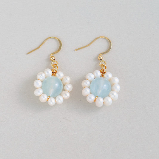 Handmade Aquamarine and Pearl Flower Dangle Earrings | 14k Gold Filled | Hypoallergenic Silicone Backs | Delicate Gift for Her