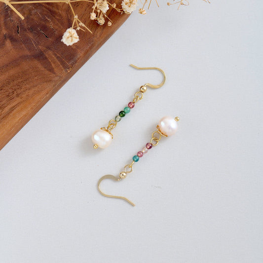 Handmade 14K Gold-Filled Wire Earrings with Natural Tourmaline & Freshwater Pearl
