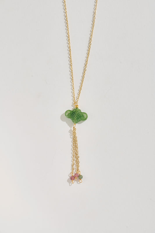 Eternal Knot – Hand-Carved Green Jade Pendant with Tourmaline Tassels & Free 14K Gold Adjustable Chain